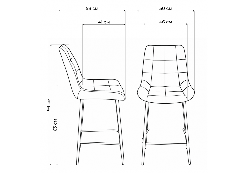 Материал каркаса - металл; Материал сиденья - велюр; Материал обивки - велюр; Цвет ножек - серый; Ширина - 50; Глубина - 58; Высота - 99; Ширина сиденья - 46; Глубина сиденья - 41; Высота сиденья - 63;