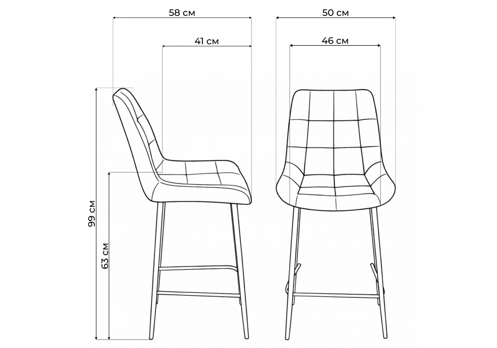 Материал каркаса - металл; Материал сиденья - велюр; Материал обивки - велюр; Ширина - 50; Глубина - 58; Высота - 99; Ширина сиденья - 46; Глубина сиденья - 41; Высота сиденья - 63;