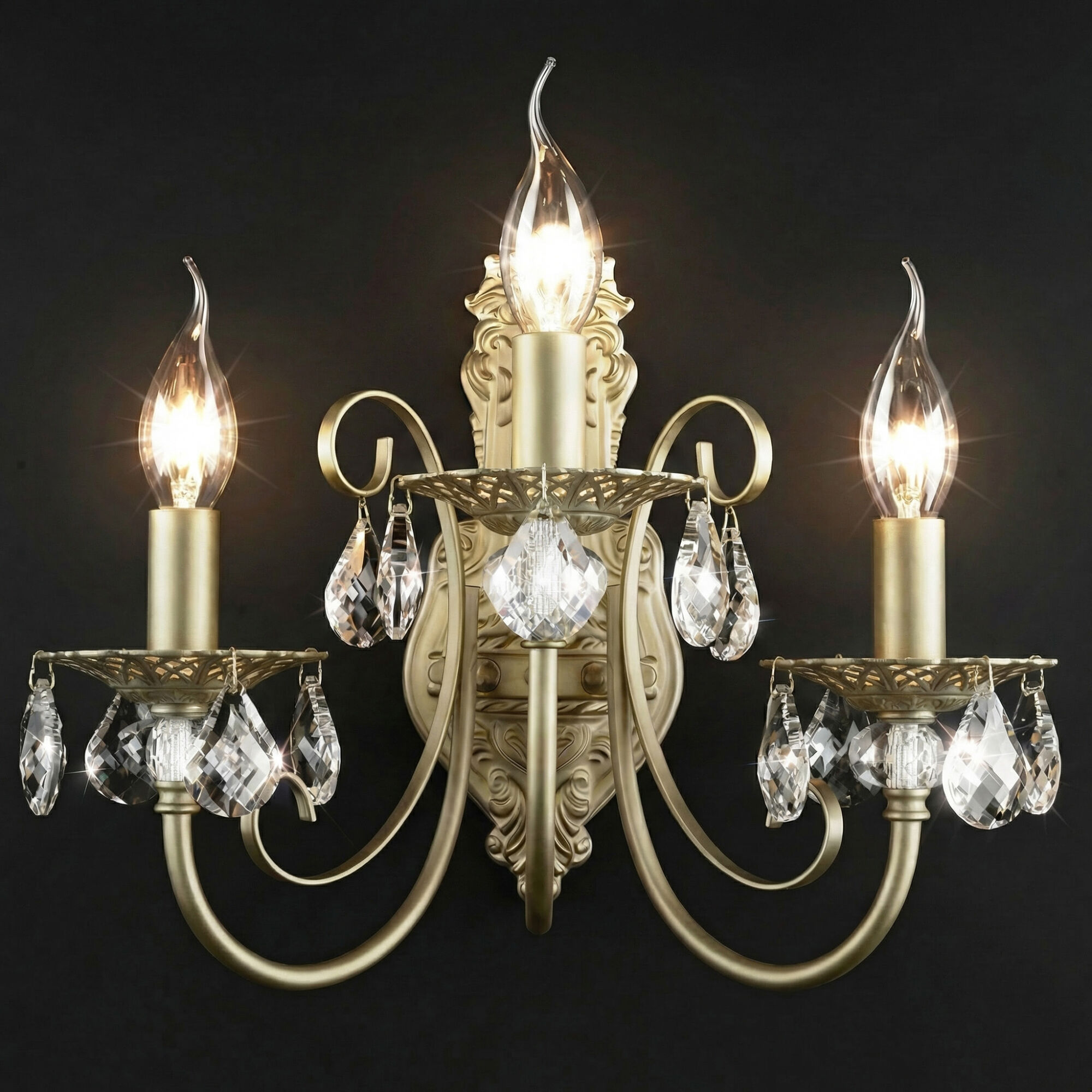 Светильник для тех, кто ценит традиции и безупречное качество. Латунная арматура с детализированными вензелями не тускнеет со временем, сохраняя благородный блеск, а бесцветный хрусталь преломляет свет, создавая эффектную игру бликов.