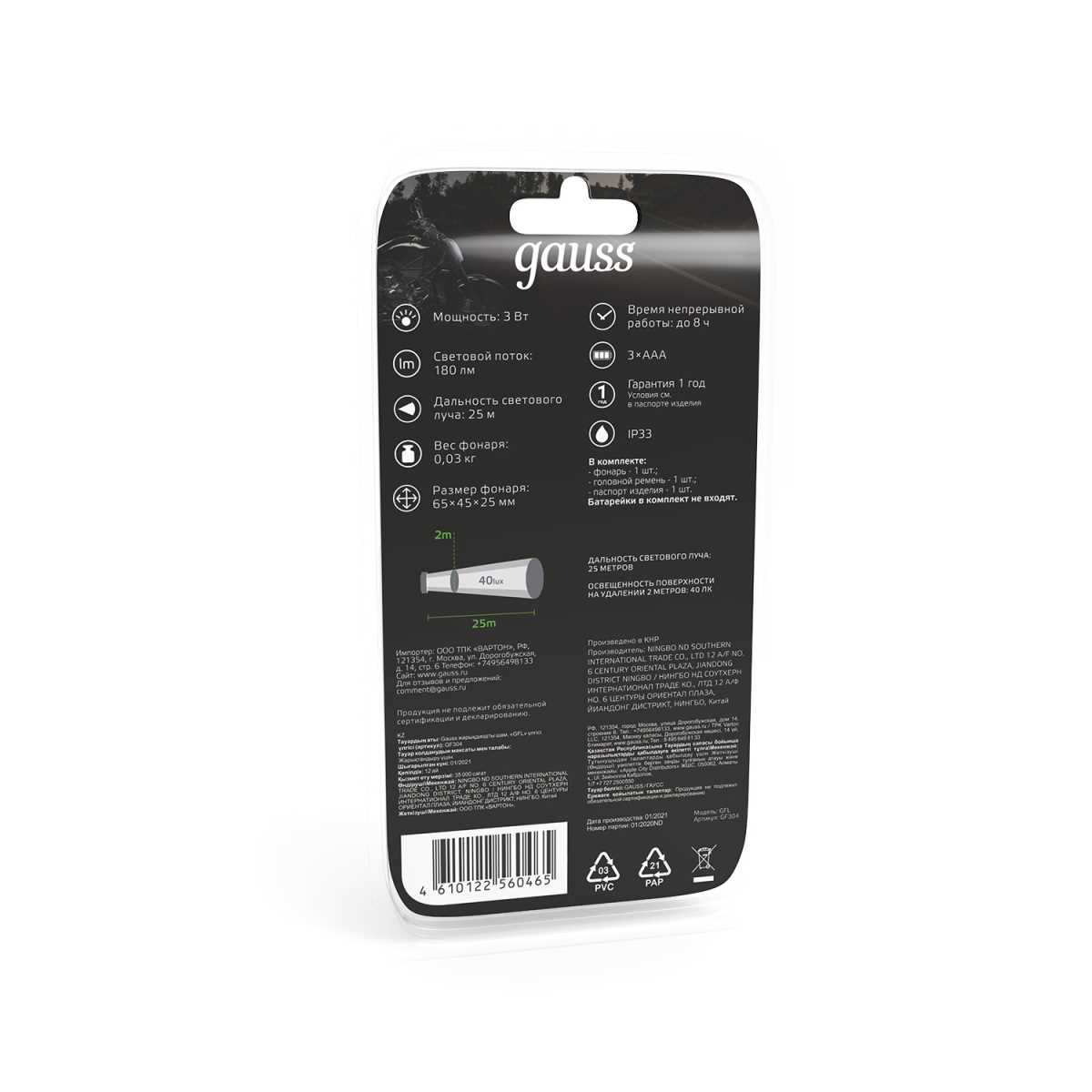 Налобный светодиодный фонарь Gauss от батареек 65х45 180 лм GF304 в Калуге
