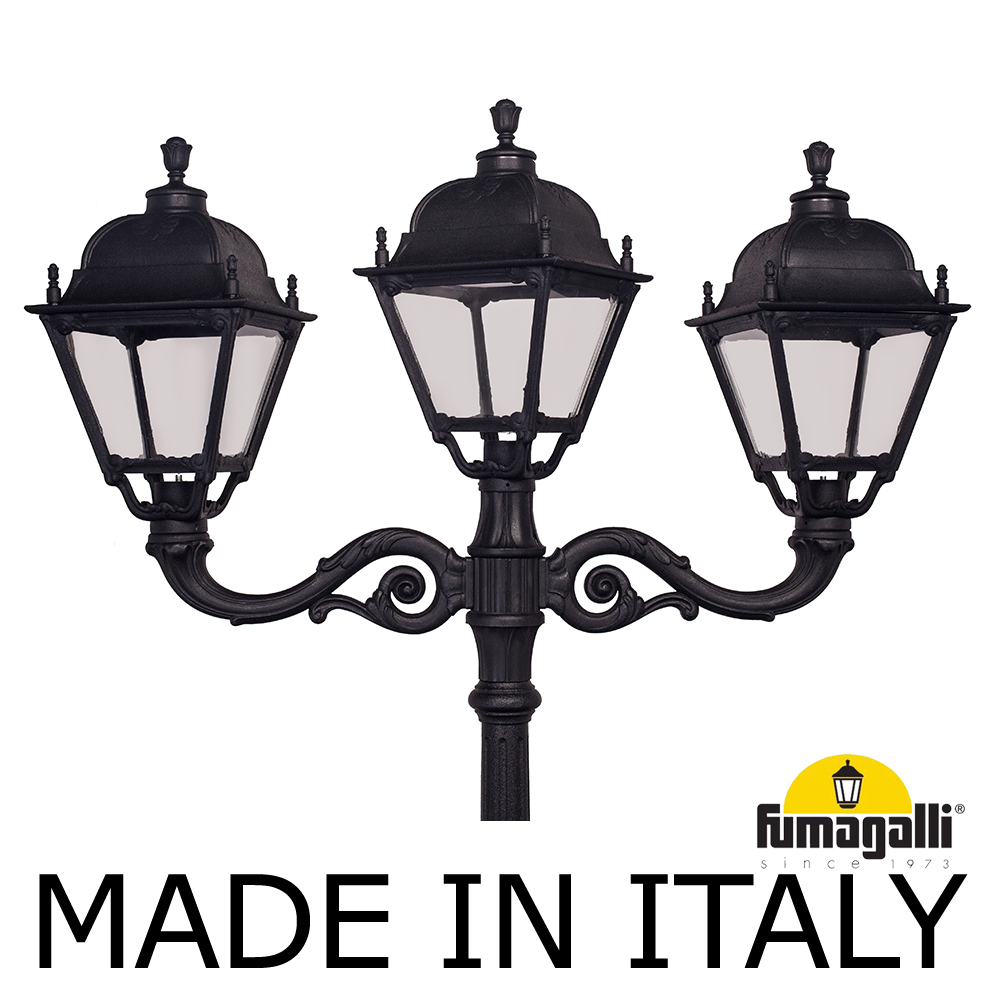 Парковый фонарь FUMAGALLI большого размера серии SIMON, модель NEBO ADAM/SIMON 2L+1. Парковый фонарь с 2 светильниками большого размера, на консолях ADAM большого размера, плюс 1 венчающий светильник, установленные на классическом столбе NEBO высотой 2,5 м (+высота фонарей на кронштейнах). Изготовлены в Италии, по уникальным технологиям "FUMATECH" из современного композитного полимера RESIN. Этот материал в 5 раз прочнее металла, не ржавеет, не окисляется, не выгорает на солнце, его не нужно красить. Все светильники пыле-влаго защищены по стандарту IP55 (Пылезащищенные, защита от водяных струй с любого направления). Рассеиватель выполнен из антивандального, не мутнеющего и не горючего PMMA (ПолиМетилМетаАкрилат). Срок службы светильника - не менее 20 лет. Температура использования от -60 до +90. В серии SIMON есть садовые фонари в настенном (OFIR/SIMON, MIRRA/SIMON) подвесном (SICHEM/SIMON) и наземном исполнении (IAFAET.R/SIMON, ALOE.R/SIMON, ARTU/SIMON, GIGI/SIMON, RICU/SIMON, NEBO/OFIR/SIMON 1L, NEBO/OFIR/SIMON 2L, TABOR/ADAM/SIMON 3L) со столбами разной высоты, с разным количеством и конфигурацией голов. Консоли настенных фонарей и кронштейны светильников на столбах освещения могут устанавливаться в положение вверх и вниз. Столбы выше 150 см имеют в основе мощную стальную трубу с двойной оцинковкой. При заказе требуется выбрать цвет корпуса, цвет плафона и тип патрона (Е-27 или LED GX-53). Возможен светодиодный вариант. По стилю и дизайну серия уличных светильников SIMON похожа на светильники среднего размера серии CEFA. По размеру относится к большим парковым светильникам как серия NOEMI и GLOBE 400.