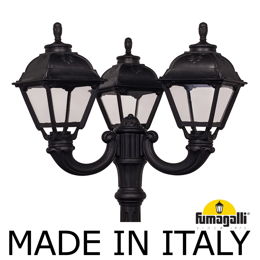 Парковый фонарь FUMAGALLI среднего размера серии CEFA, модель NEBO OFIR/CEFA 3L. Парковый фонарь с 3 светильниками, на консолях OFIR среднего размера, установленных на классическом столбе NEBO высотой 2,5 м (+высота фонарей на кронштейнах). Изготовлены в Италии, по уникальным технологиям "FUMATECH" из современного композитного полимера RESIN. Этот материал в 5 раз прочнее металла, не ржавеет, не окисляется, не выгорает на солнце, его не нужно красить. Все светильники пыле-влаго защищены по стандарту IP55 (Пылезащищенные, защита от водяных струй с любого направления). Рассеиватель выполнен из антивандального, не мутнеющего и не горючего PMMA (ПолиМетилМетаАкрилат). Срок службы светильника - не менее 20 лет. Температура использования от -60 до +90. В серии CEFA есть садовые фонари в настенном (OFIR/CEFA, MIRRA/CEFA) подвесном (SICHEM/CEFA) и наземном исполнении (IAFAET.R/CEFA, ALOE.R/CEFA, ARTU/CEFA, GIGI/CEFA, RICU/CEFA, NEBO/OFIR/CEFA 1L, NEBO/OFIR/ANNA 2L, TABOR/ADAM/CEFA 3L) со столбами разной высоты, с разным количеством и конфигурацией голов. Консоли настенных фонарей и кронштейны светильников на столбах освещения могут устанавливаться в положение вверх и вниз. Столбы выше 150 см имеют в основе мощную стальную трубу с двойной оцинковкой. При заказе требуется выбрать цвет корпуса, цвет плафона и тип патрона (Е-27 или LED GX-53). Возможен светодиодный вариант. По стилю и дизайну серия уличных светильников CEFA похожа на светильники большого размера серии SIMON . По размеру относится к средним парковым светильникам как серия RUT и GLOBE 300.