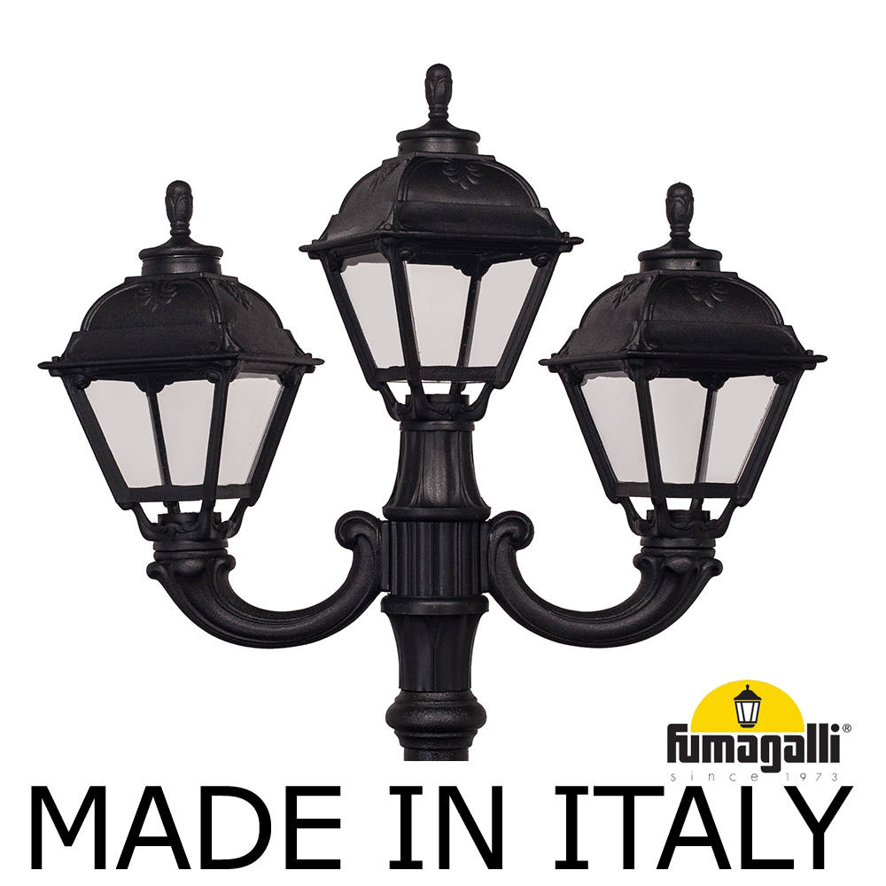 Парковый фонарь FUMAGALLI среднего размера серии CEFA, модель TABOR OFIR/CEFA 2L+1. Парковый фонарь с 2 светильниками на консолях OFIR + 1 венчающий, установленных на классическом столбе TABOR высотой 3,0 м (+высота фонарей на кронштейнах). Изготовлены в Италии, по уникальным технологиям "FUMATECH" из современного композитного полимера RESIN. Этот материал в 5 раз прочнее металла, не ржавеет, не окисляется, не выгорает на солнце, его не нужно красить. Все светильники пыле-влаго защищены по стандарту IP55 (Пылезащищенные, защита от водяных струй с любого направления). Рассеиватель выполнен из антивандального, не мутнеющего и не горючего PMMA (ПолиМетилМетаАкрилат). Срок службы светильника - не менее 20 лет. Температура использования от -60 до +90. В серии CEFA есть садовые фонари в настенном (OFIR/CEFA, MIRRA/CEFA) подвесном (SICHEM/CEFA) и наземном исполнении (IAFAET.R/CEFA, ALOE.R/CEFA, ARTU/CEFA, GIGI/CEFA, RICU/CEFA, NEBO/OFIR/CEFA 1L, NEBO/OFIR/ANNA 2L, TABOR/ADAM/CEFA 3L) со столбами разной высоты, с разным количеством и конфигурацией голов. Консоли настенных фонарей и кронштейны светильников на столбах освещения могут устанавливаться в положение вверх и вниз. Столбы выше 150 см имеют в основе мощную стальную трубу с двойной оцинковкой. При заказе требуется выбрать цвет корпуса, цвет плафона и тип патрона (Е-27 или LED GX-53). Возможен светодиодный вариант. По стилю и дизайну серия уличных светильников CEFA похожа на светильники большого размера серии SIMON . По размеру относится к средним парковым светильникам как серия RUT и GLOBE 300.
