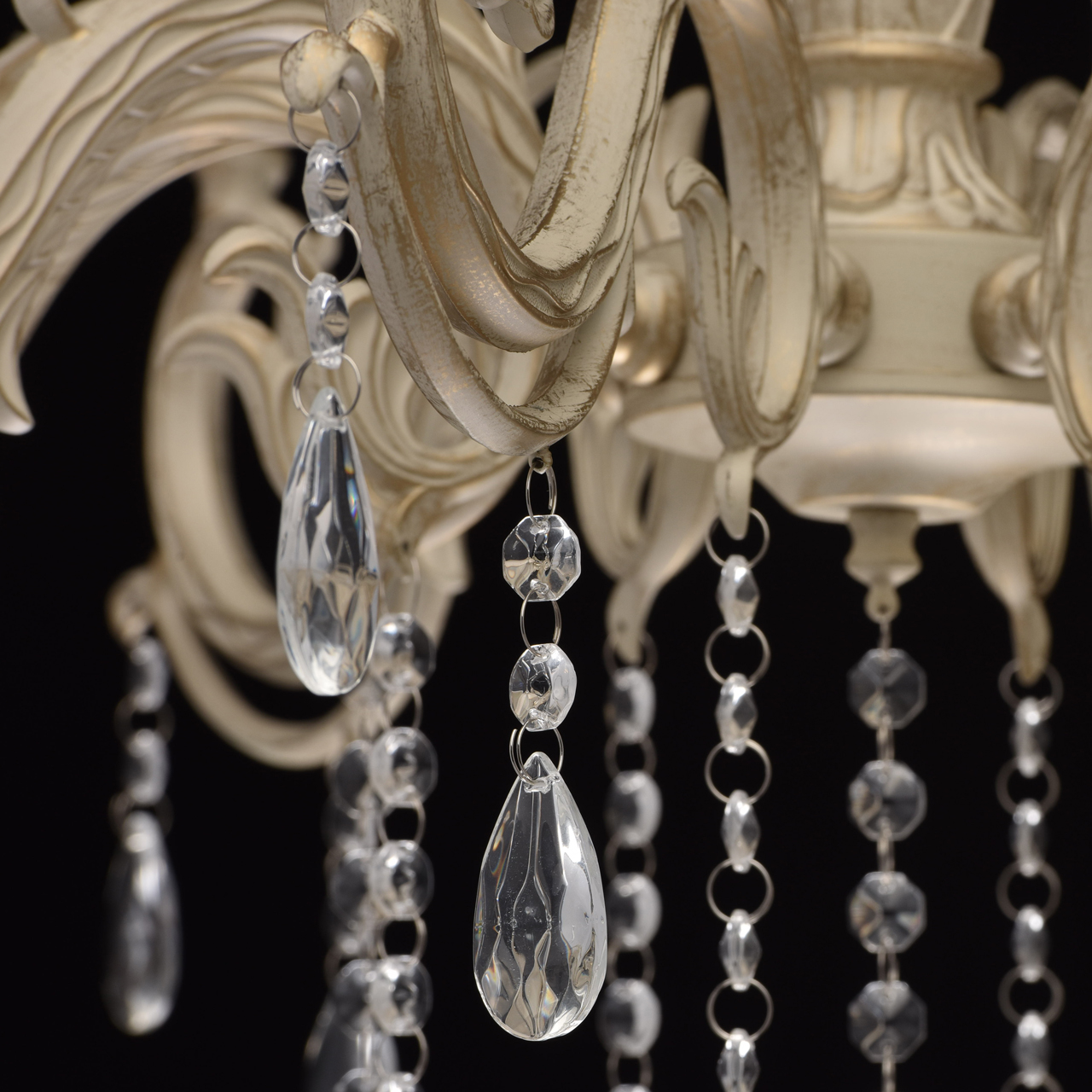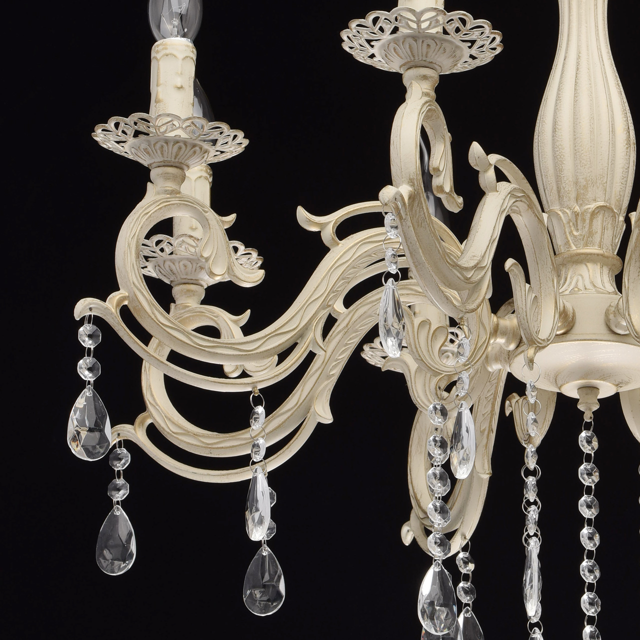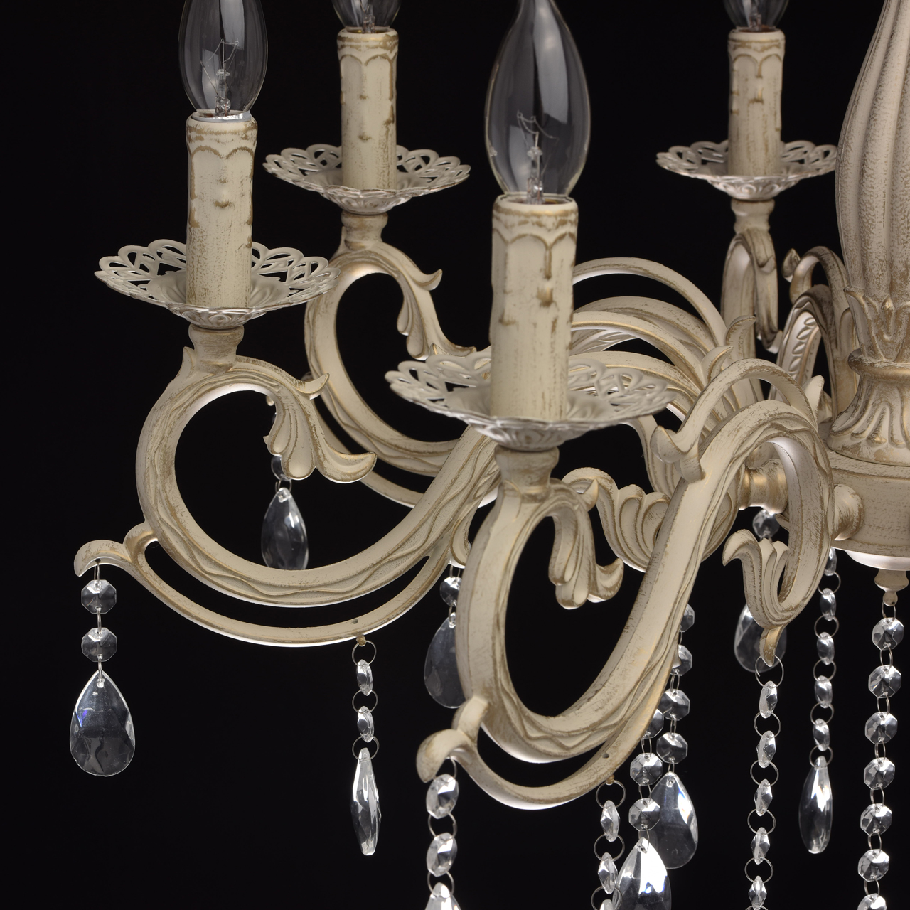 Основание из сплава металлов покрыто в технике хай-лайт: основной слой белой краски патинирован золотом. Короткий подвес 15 см в виде цепи позволяет использовать люстру в комнатах со стандартными потолками. Центральный стержень и рожки выполнены в изящных формах, украшены кружевными розетками. Плафоны отсутствуют, вместо них использованы лампы в форме свечей. Достоверное сходство с канделябром обеспечивают надпатронники с эффектом оплавленного воска. Венчают композицию россыпи из прозрачного хрусталя.
