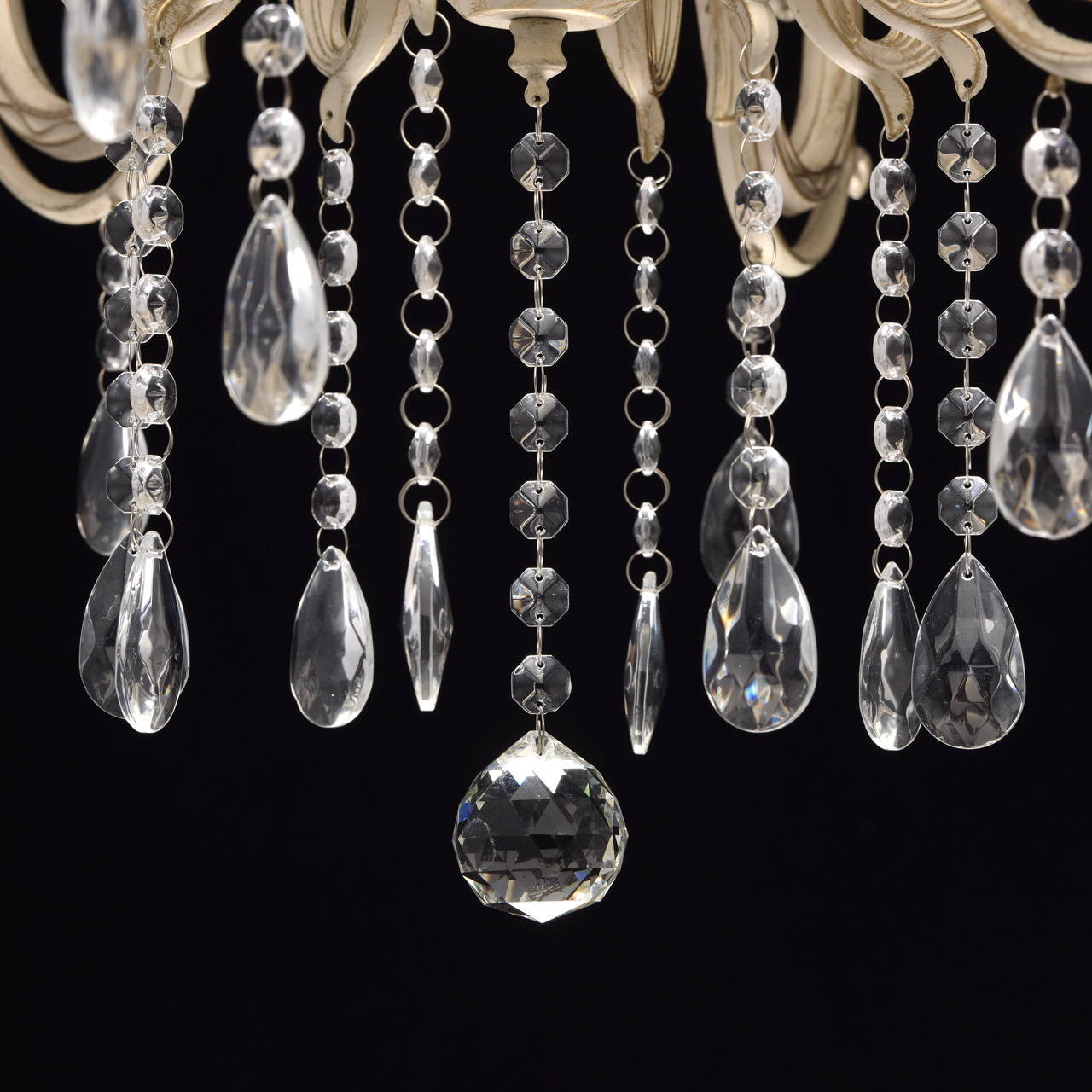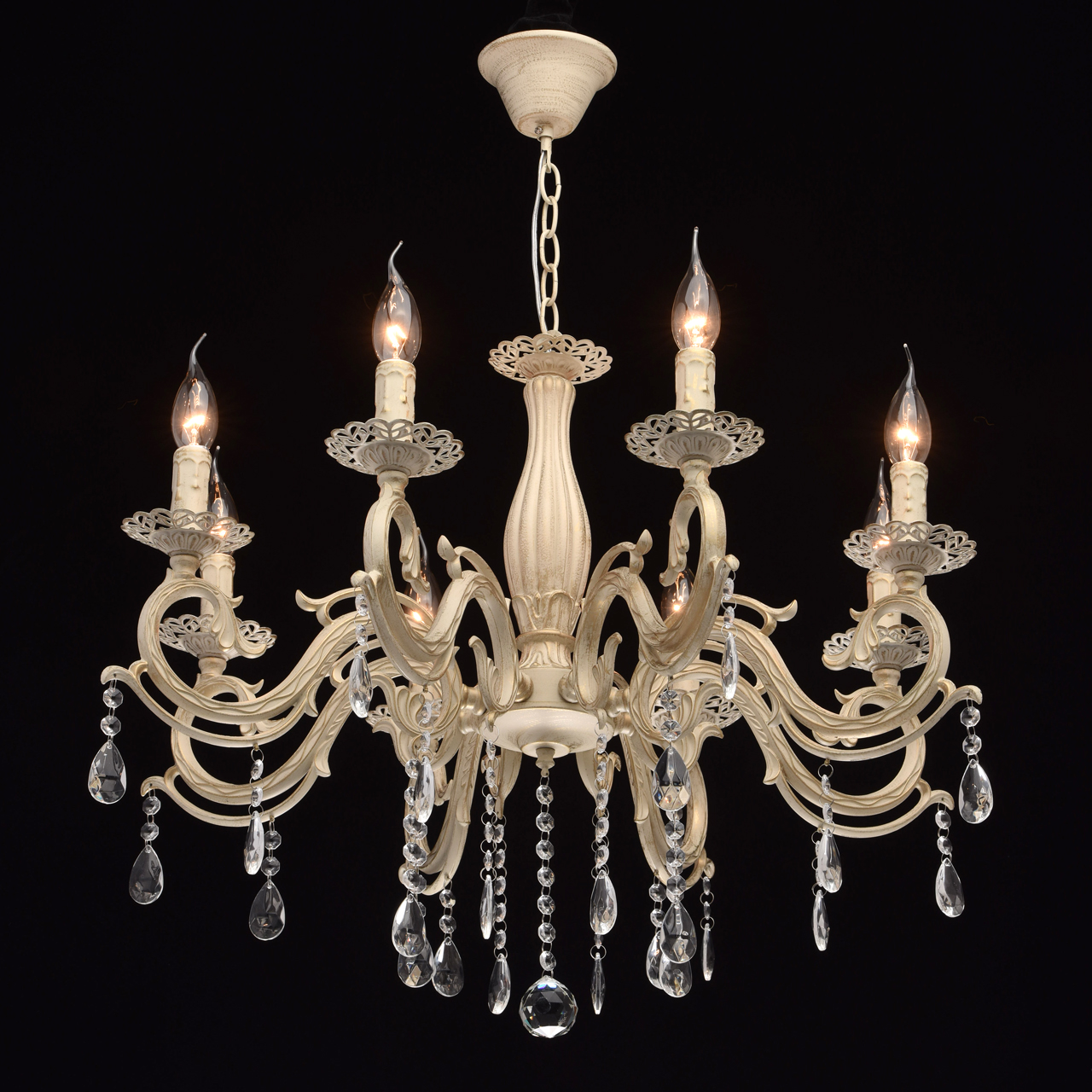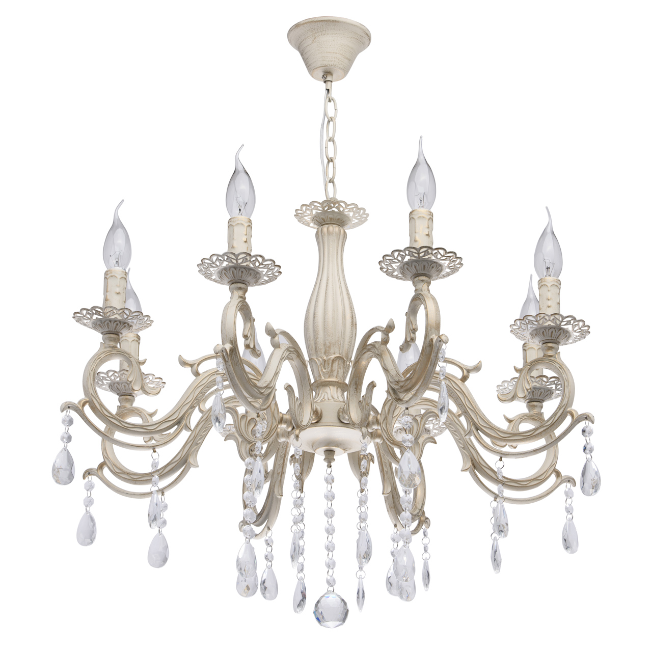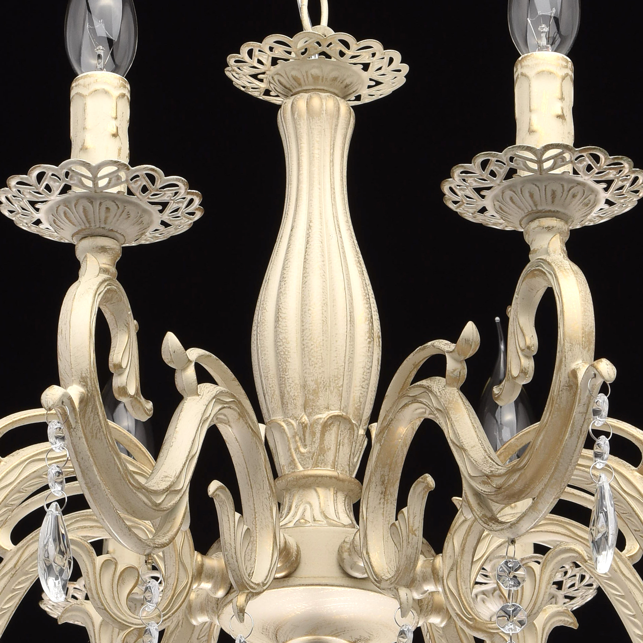 Основание из сплава металлов покрыто в технике хай-лайт: основной слой белой краски патинирован золотом. Короткий подвес 15 см в виде цепи позволяет использовать люстру в комнатах со стандартными потолками. Центральный стержень и рожки выполнены в изящных формах, украшены кружевными розетками. Плафоны отсутствуют, вместо них использованы лампы в форме свечей. Достоверное сходство с канделябром обеспечивают надпатронники с эффектом оплавленного воска. Венчают композицию россыпи из прозрачного хрусталя.