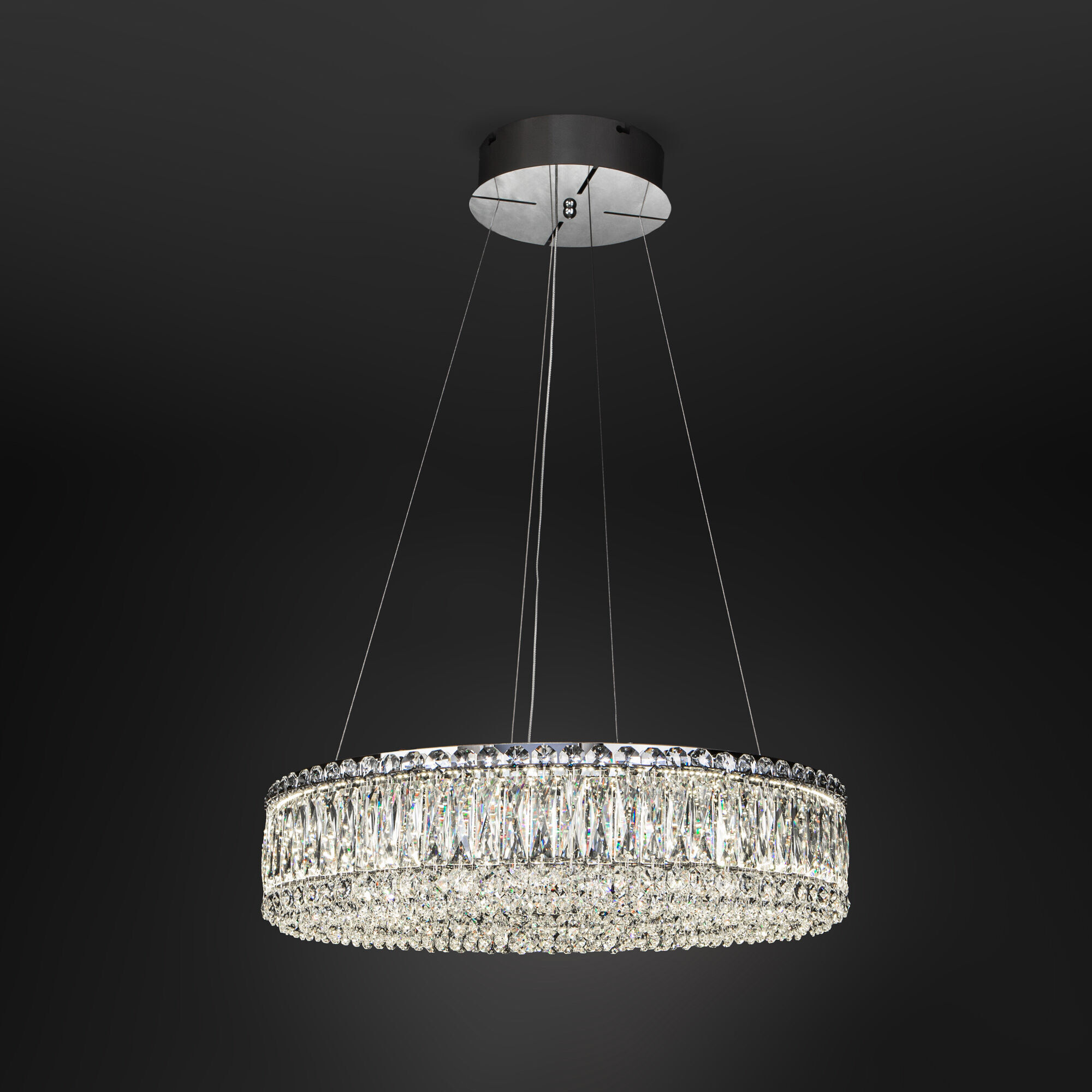 Круглая форма и обилие хрустальных подвесок делают эту люстру настоящим произведением искусства. Сверкающие хрустальные элементы, искусно расположенные по кругу светильника, обладают безупречной прозрачностью и чистотой. Основание люстры из хромированного металла обеспечивает долговечность.
