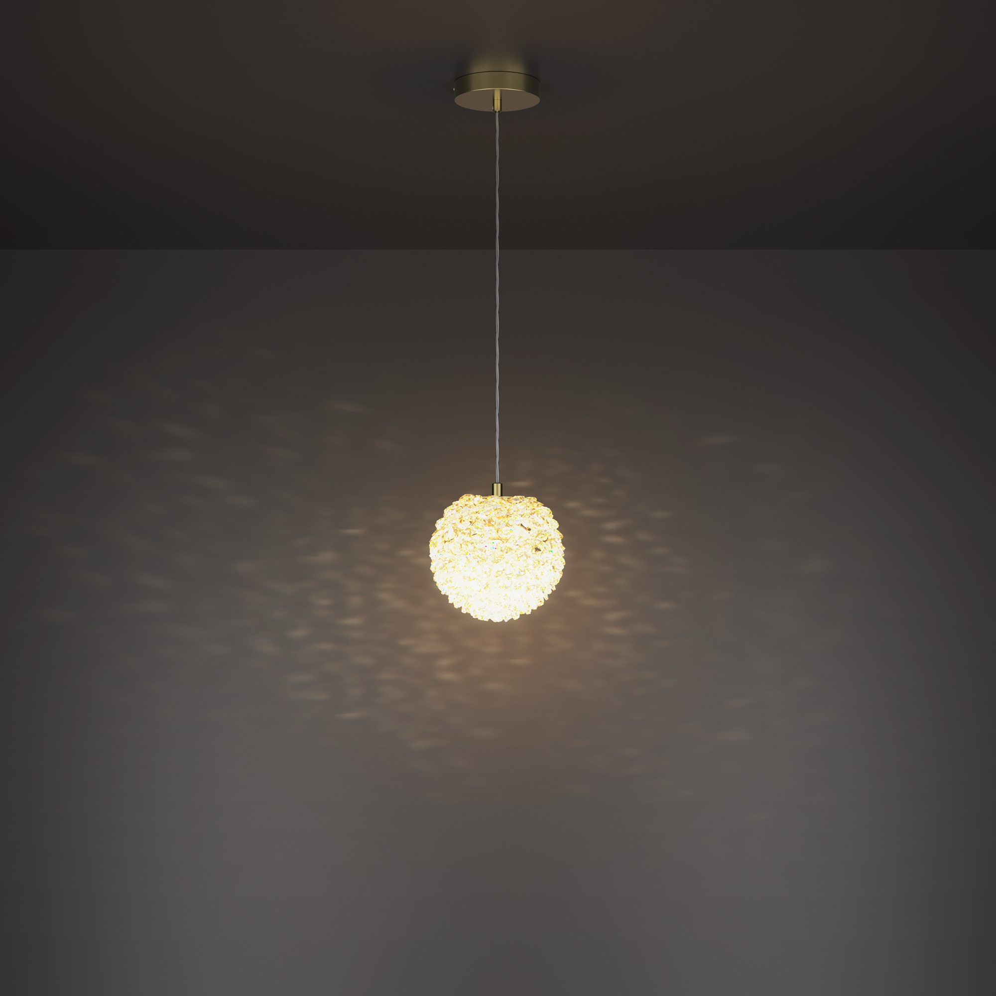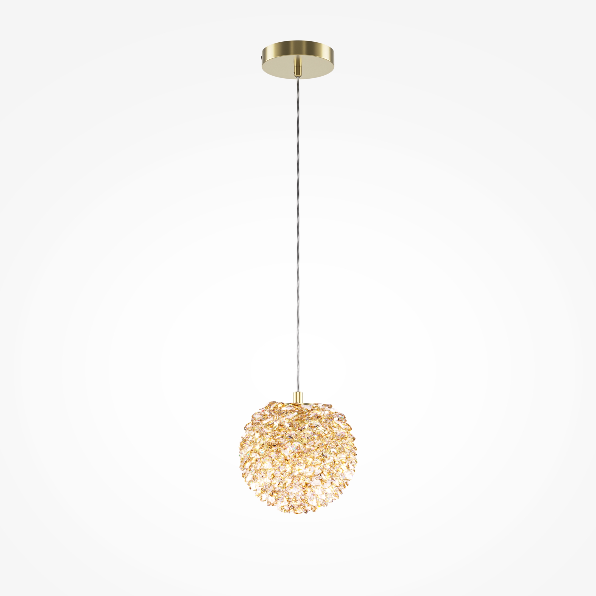 Подвесной светильник выполнен из металла в цвете теплой латуни с плафоном из хрусталя. Сменный источник света, цоколь: G9. Диаметр плафона: 130 мм, высота регулируется до 3183 мм. Светильник состоит из множества хрустальных элементов, создающих эффект мерцания. Предназначен для использования в интерьерах классического и современного стилей. Рекомендуется для гостиных, столовых и спален. Возможность комбинирования нескольких подвесов на разной высоте для создания каскадного эффекта.