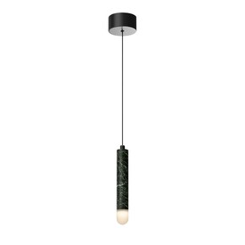 Главный акцент серии — натуральный зелёный мрамор с его неповторимым природным рисунком. Чёрная металлическая арматура создаёт гармоничный контраст. LED-источник с температурой 3000К, скрытый за акриловым рассеивателем, создаёт атмосферную подсветку для деликатного зонирования. В серии представлены подвесы двух форм — конус и вытянутый цилиндр, которые можно использовать как сольные акценты или комбинировать в многоуровневые композиции, меняя длину провода (3000 мм).