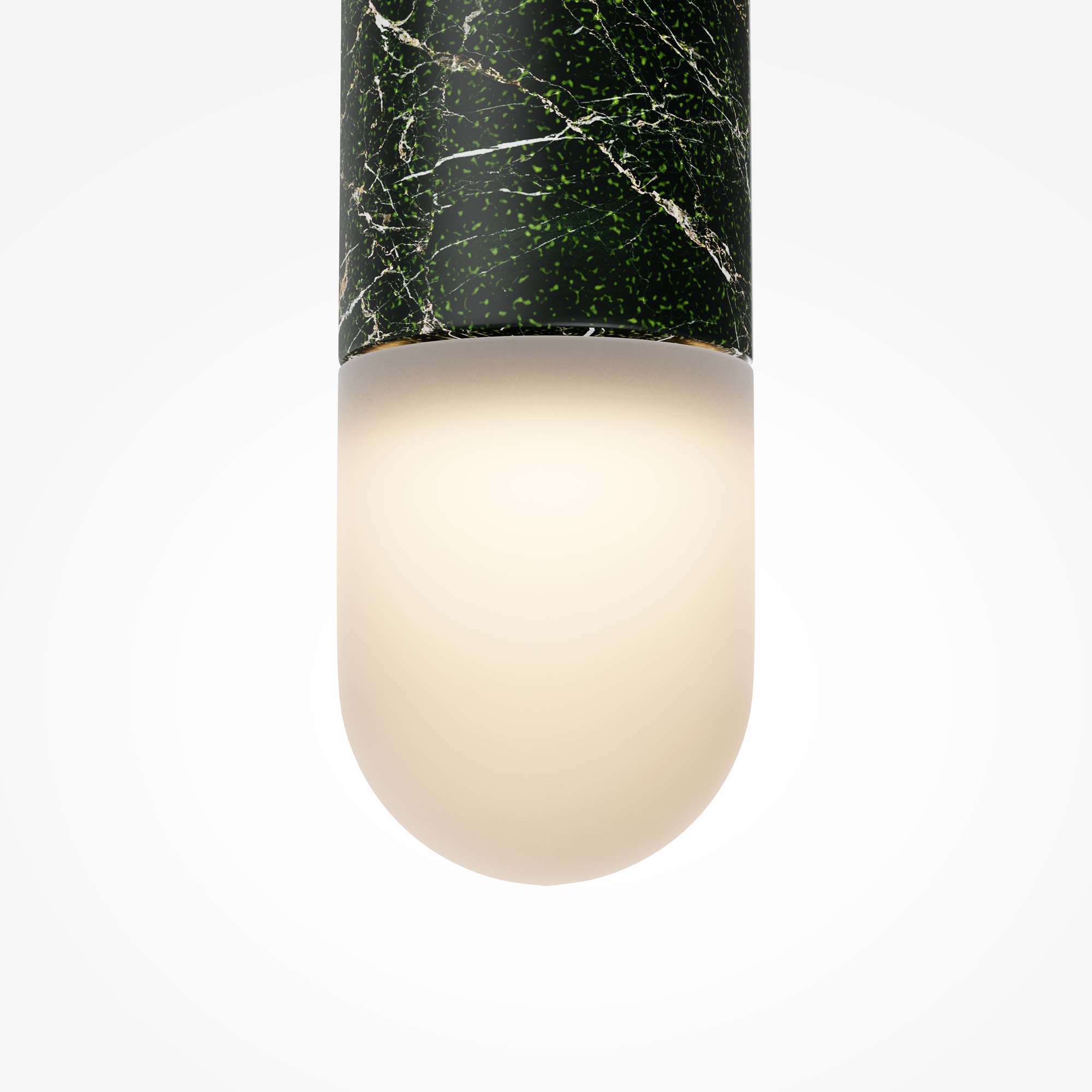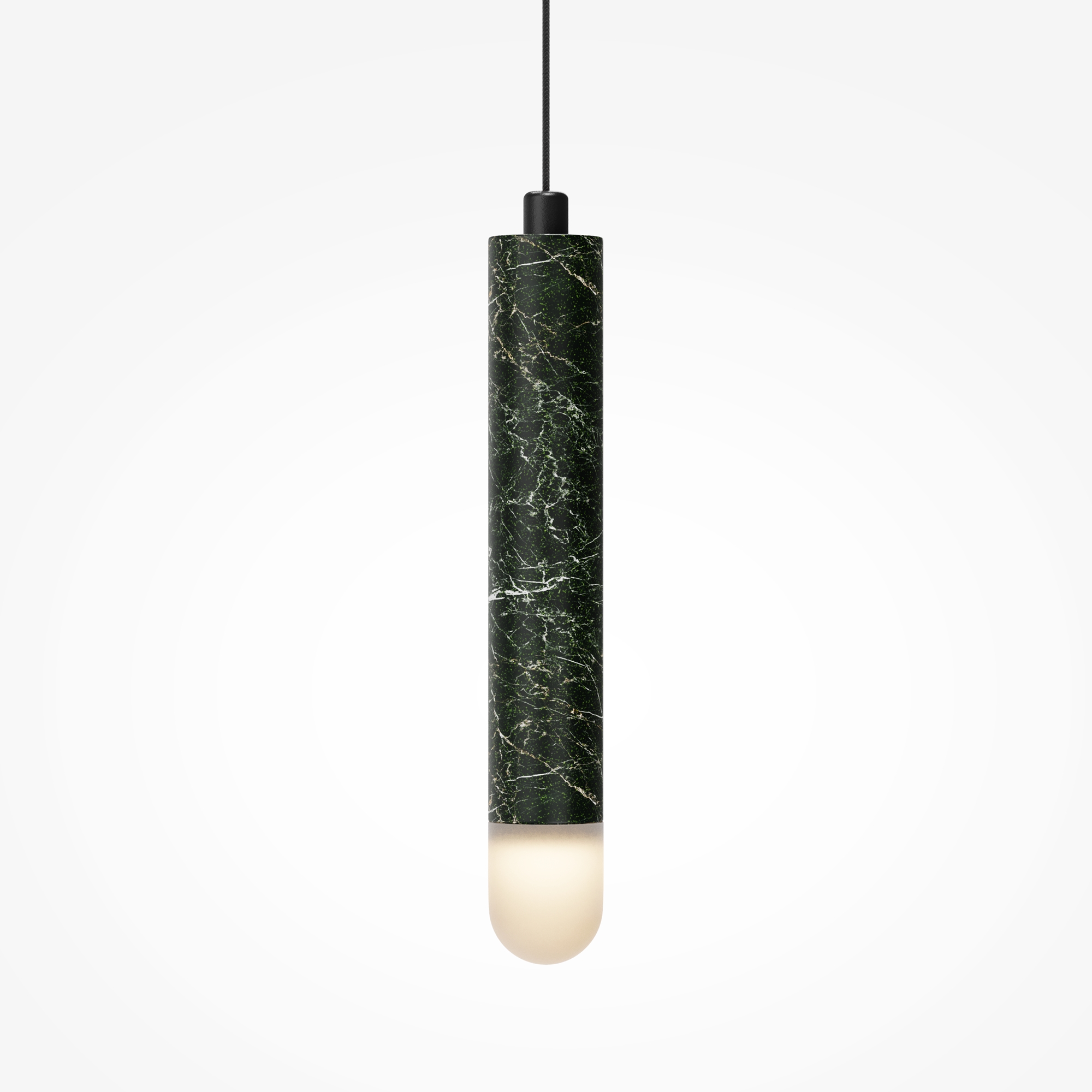 Главный акцент серии — натуральный зелёный мрамор с его неповторимым природным рисунком. Чёрная металлическая арматура создаёт гармоничный контраст. LED-источник с температурой 3000К, скрытый за акриловым рассеивателем, создаёт атмосферную подсветку для деликатного зонирования. В серии представлены подвесы двух форм — конус и вытянутый цилиндр, которые можно использовать как сольные акценты или комбинировать в многоуровневые композиции, меняя длину провода (3000 мм).