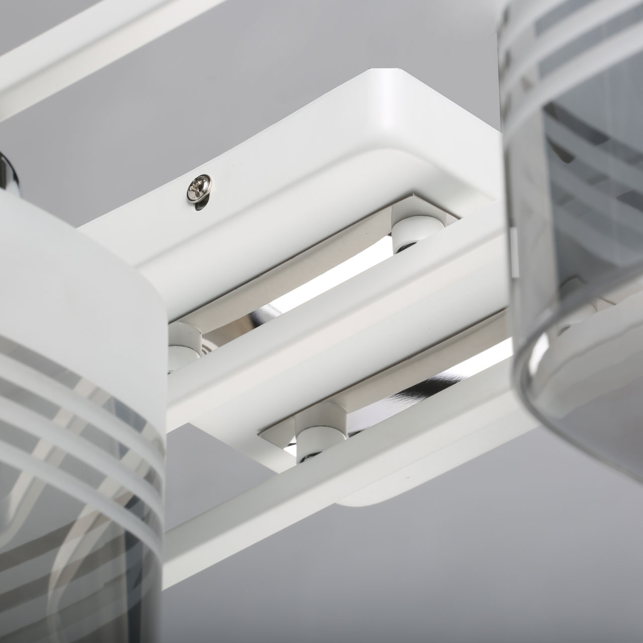 Металлическое основание потолочного светильника окрашено в белый цвет. Отдельные элементы гальванизированы в цвет хрома. Стеклянные плафоны гальванизированы в дымчатый цвет и окрашены в белый цвет в виде параллельных полос
