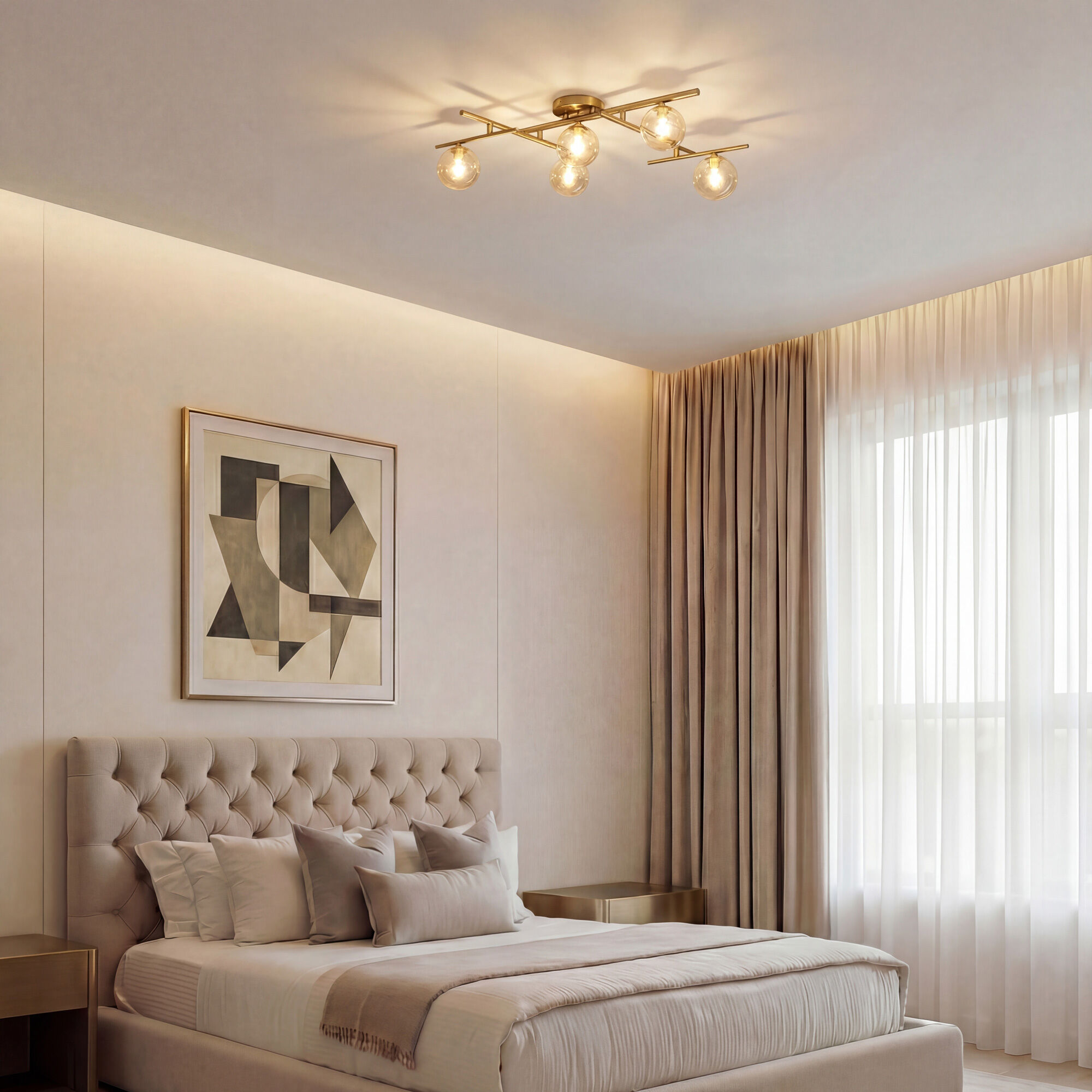 Потолочный светильник из коллекции Liana станет прекрасным дополнением к вашей гостиной, спальне или столовой. Геометрическая конструкция в сочетании со стеклянными янтарными плафонами создает современный и утонченный вид.