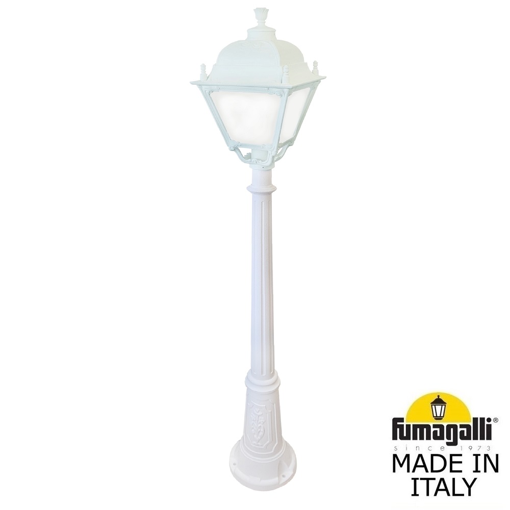 Садово-парковый фонарь FUMAGALLI среднего размера серии SIMON, модель ARTU/SIMON. Парковый фонарь с 1 венчающим светильником большого размера в на классическом столбе ARTU высотой 1,5 м (+высота фонаря). Предназначен для освещения парковых дорожек, cкверов, садовых и ландшафтных композиций, и других общественных пространств. Используется в качестве основного уличного освещения на городских улицах и площадях. Изготовлены в Италии, по уникальным технологиям "FUMATECH" из современного композитного полимера RESIN. Этот материал в 5 раз прочнее металла, не ржавеет, не окисляется, не выгорает на солнце, его не нужно красить. Все светильники пыле-влаго защищены по стандарту IP55 (Пылезащищенные, защита от водяных струй с любого направления). Рассеиватель выполнен из антивандального, не мутнеющего и не горючего PMMA (ПолиМетилМетаАкрилат). Срок службы светильника - не менее 20 лет. Температура использования от -60 до +90. В серии SIMON есть садовые фонари в настенном (OFIR/SIMON, MIRRA/SIMON) подвесном (SICHEM/SIMON) и наземном исполнении (IAFAET.R/SIMON, ALOE.R/SIMON, ARTU/SIMON, GIGI/SIMON, RICU/SIMON, NEBO/OFIR/SIMON 1L, NEBO/OFIR/SIMON 2L, TABOR/ADAM/SIMON 3L) со столбами разной высоты, с разным количеством и конфигурацией голов. Консоли настенных фонарей и кронштейны светильников на столбах освещения могут устанавливаться в положение вверх и вниз. Столбы выше 150 см имеют в основе мощную стальную трубу с двойной оцинковкой. При заказе требуется выбрать цвет корпуса, цвет плафона и тип патрона (Е-27 или LED GX-53). Возможен светодиодный вариант. По стилю и дизайну серия уличных светильников SIMON похожа на светильники среднего размера серии CEFA. По размеру относится к большим парковым светильникам как серия NOEMI и GLOBE 400.