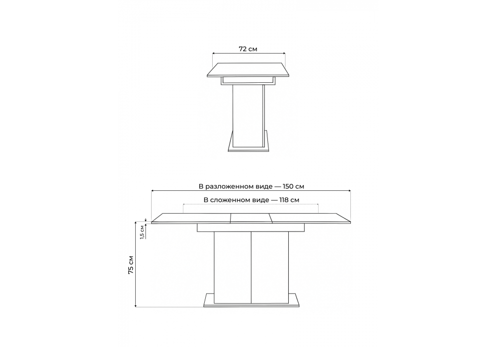 Материал каркаса - ЛДСП; Материал столешницы - ЛДСП; Ширина - 72,5; Высота - 75,5; Длина стола в разложенном виде - 150; Длина - 118;