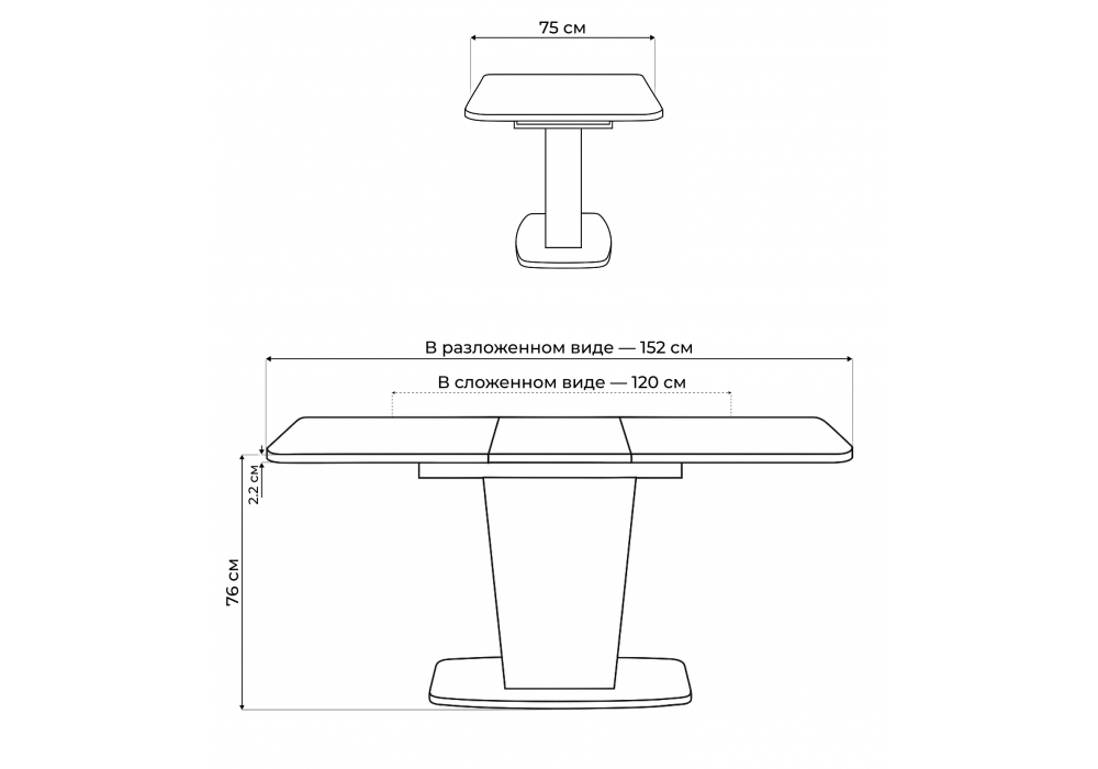 Толщина столешницы: 2,2 см. Материал каркаса - ЛДСП; Ширина - 75; Высота - 76; Длина стола в разложенном виде - 152; Длина - 120;