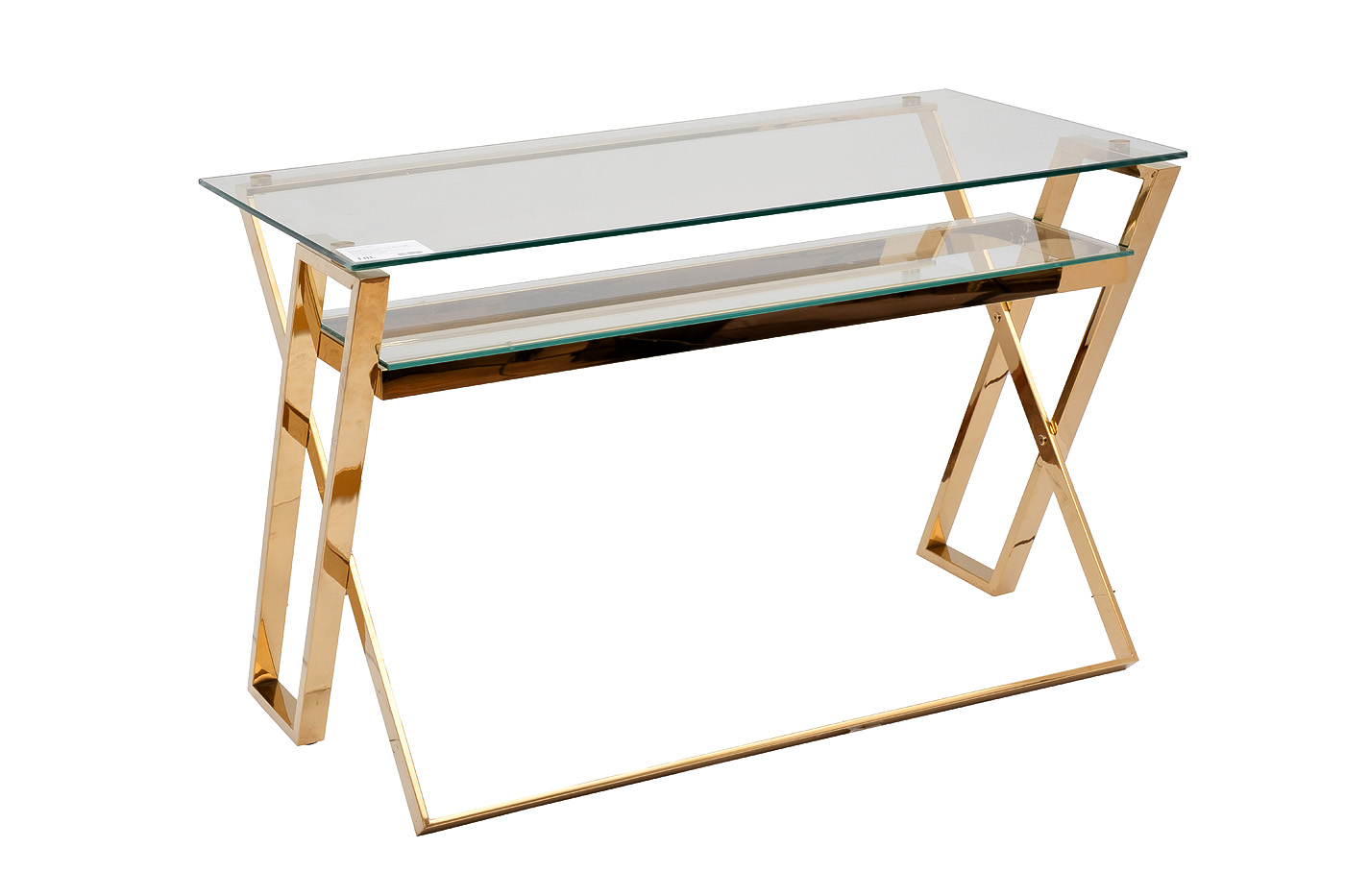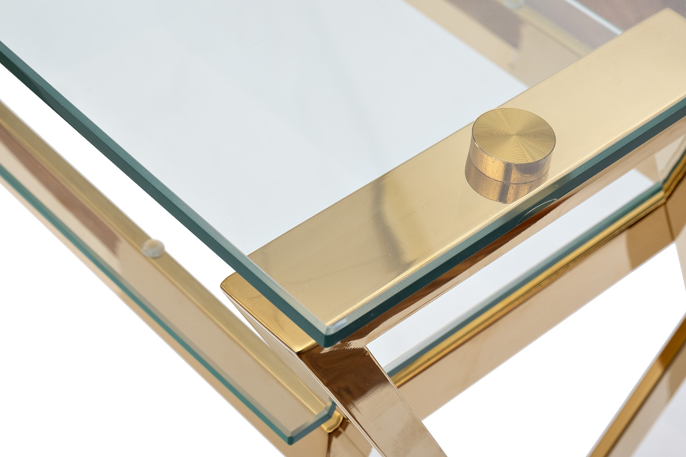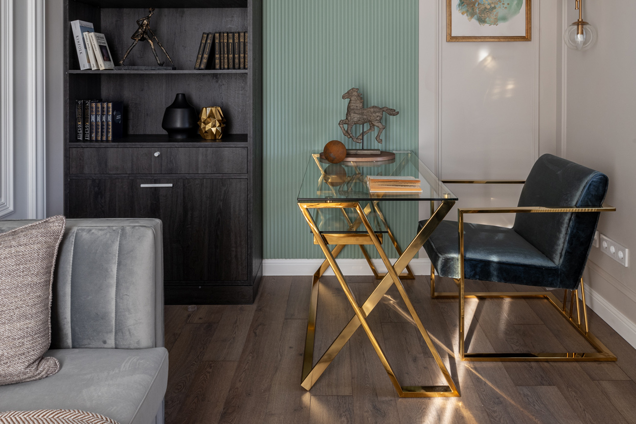 Дизайнерский письменный стол со столешницей из прозрачного стекла – мебель, которая отлично справляется не только с основной функцией, но и решает декоративные задачи в интерьере. Письменный стол из стекла выглядит необычно, однако в этом и заключается его привлекательность. Это превосходный выбор для рабочего кабинета, оформленного в стилистике ар-деко, неоклассика. Каркас из нержавеющей стали с золотым блеском придает конструкции устойчивости и надежности, а за счет стеклянной столешницы стол выглядит легким и изящным. Для письменных принадлежностей предусмотрена полка из стекла. Компания Garda Decor предлагает купить письменный стол с доставкой к вам.