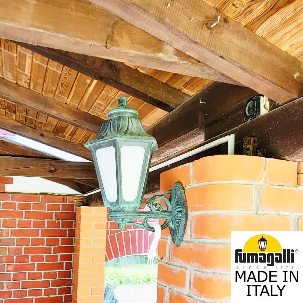 Светильники уличные настенные FUMAGALLI серии ANNA, модель ANNA/BISSO. Консольный уличный светильник для монтажа на стену. Настенный кронштейн BISSO малого размера и светильник ANNA. Используются для фасадного и архитектурного освещения в стиле "классика". Место установки уличных светильников - фасады, колонны и другие вертикальные поверхности исторических зданий, котеджей, загородных домов, церквей, а так же, другие места где требуется и возможна установка фонарей. Изготовлены в Италии, по уникальным технологиям "FUMAGALLI" из современного композитного полимера RESIN. Этот материал в 5 раз прочнее металла, не ржавеет, не окисляется, не выгорает на солнце, его не нужно красить. Все светильники пыле-влаго защищены по стандарту IP55 (защита от пыли, защита от струй воды, падающих под любым углом). Рассеиватель выполнен из антивандального, не мутнеющего и не горючего PMMA (ПолиМетилМетаАкрилат). Срок службы светильника - не менее 20 лет. Температура использования от -60 до +90. В серии ANNA есть фонари в настенном (BISSO/ANNA, PORPORA/ANNA) подвесном (SICHEM/ANNA, SICHEM/ANNA 3L) и наземном исполнении (IAFAET.R/ANNA, ALOE.R/ANNA, ARTU/ANNA, GIGI/ANNA, RICU/ANNA, RICU/ISSO/ANNA 1L, RICU/ISSO/ANNA 2L, RICU/ISSO/ANNA 3L) со столбами разной высоты, с разным количеством и конфигурацией голов. Консоли настенных фонарей и кронштейны светильников на столбах освщения могут устанавливаться вверх/вниз. Столбы выше 150 см имеют в основе мощную стальную трубу с двойной оцинковкой. При заказе требуется выбрать цвет корпуса, цвет плафона и тип патрона. Возможен светодиодный вариант с LED цоколем GX-53. По стилю и дизайну серия уличных светильников ANNA похожа на светильники среднего размера серии RUT и на светильники большого размера серии NOEMI. По размеру ANNA относится к малым светильникам как серия SABA и GLOBE 250.