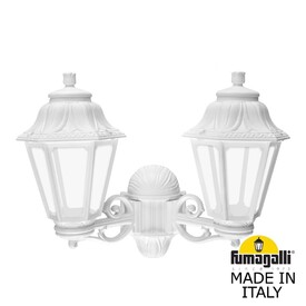 Светильники уличные настенные FUMAGALLI серии ANNA, модель PORPORA/ANNA. Консольный уличный светильник из 2-х фонарей ANNA, на кронштейнах BISSO малого размера, для монтажа на стену. Используются для фасадного и архитектурного освещения в стиле "классика". Место установки уличных светильников - фасады, колонны и другие вертикальные поверхности исторических зданий, котеджей, загородных домов, церквей, а так же, другие места где требуется и возможна установка фонарей. Изготовлены в Италии, по уникальным технологиям "FUMAGALLI" из современного композитного полимера RESIN. Этот материал в 5 раз прочнее металла, не ржавеет, не окисляется, не выгорает на солнце, его не нужно красить. Все светильники пыле-влаго защищены по стандарту IP55 (защита от пыли, защита от струй воды, падающих под любым углом). Рассеиватель выполнен из антивандального, не мутнеющего и не горючего PMMA (ПолиМетилМетаАкрилат). Срок службы светильника - не менее 20 лет. Температура использования от -60 до +90. В серии ANNA есть фонари в настенном (BISSO/ANNA, PORPORA/ANNA) подвесном (SICHEM/ANNA, SICHEM/ANNA 3L) и наземном исполнении (IAFAET.R/ANNA, ALOE.R/ANNA, ARTU/ANNA, GIGI/ANNA, RICU/ANNA, RICU/ISSO/ANNA 1L, RICU/ISSO/ANNA 2L, RICU/ISSO/ANNA 3L) со столбами разной высоты, с разным количеством и конфигурацией голов. Консоли настенных фонарей и кронштейны светильников на столбах освщения могут устанавливаться вверх/вниз. Столбы выше 150 см имеют в основе мощную стальную трубу с двойной оцинковкой. При заказе требуется выбрать цвет корпуса, цвет плафона и тип патрона. Возможен светодиодный вариант с LED цоколем GX-53. По стилю и дизайну серия уличных светильников ANNA похожа на светильники среднего размера серии RUT и на светильники большого размера серии NOEMI. По размеру ANNA относится к малым светильникам как серия SABA и GLOBE 250.